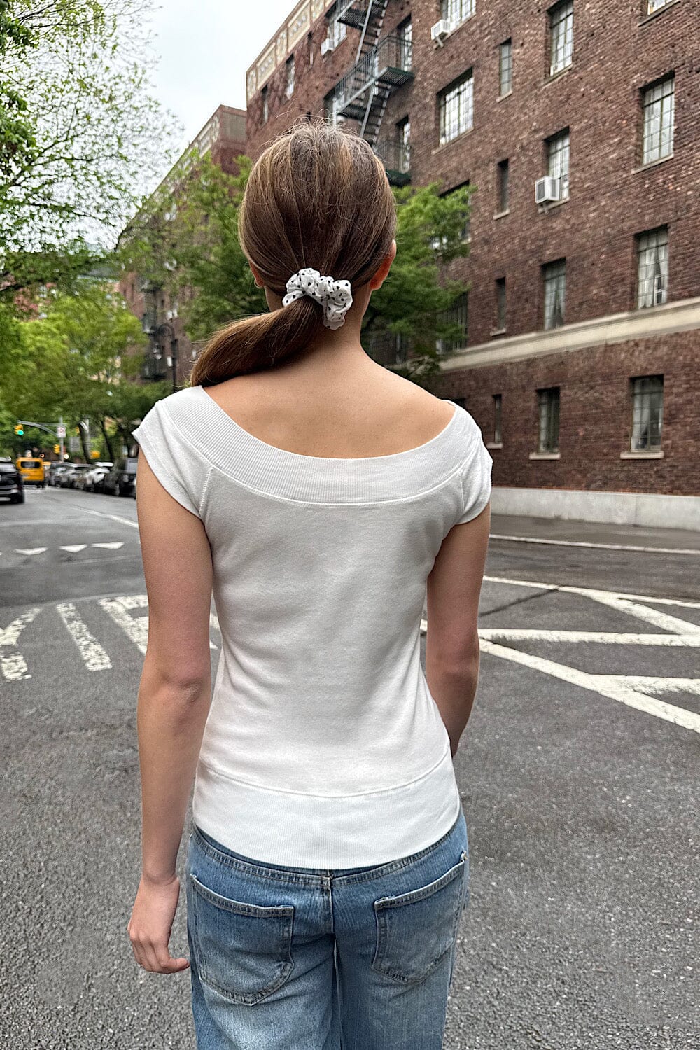 Cotton blend short sleeve, boat neck, stretchy, fitted, with bare shoulders.